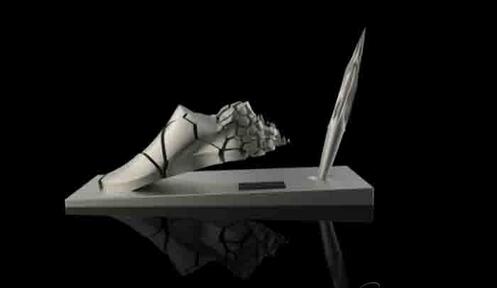 隨著3D打印的出現以及被廣泛應用,一大批優秀的設計師將一件件極具藝術美感的設計作品精確形像地還原于觀眾的視線。這件極具藝術設計感的跑鞋臺牌作品是國內著名的美女設計師宋波紋設計的一款商務禮品,鞋子的造型表達的是關于速度,在奔跑的時候產生形象延時的感覺,裂變的重復排列讓鞋子帶有一定的力量感。而整體形象是一個動態的靜幀,動靜結合,讓小雕塑穩重、生動。