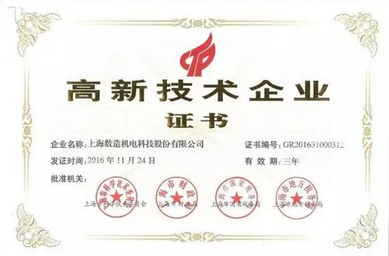 2017年2月7日,上海數(shù)造機(jī)電科技股份有限公司收到了由上海市科學(xué)技術(shù)委員會(huì)、上海市財(cái)政局、上海市國(guó)家稅務(wù)局、上海市地方稅務(wù)局聯(lián)合頒發(fā)的“高新技術(shù)企業(yè)”認(rèn)定證書(shū),正式邁入國(guó)家高新技術(shù)企業(yè)行業(yè)。