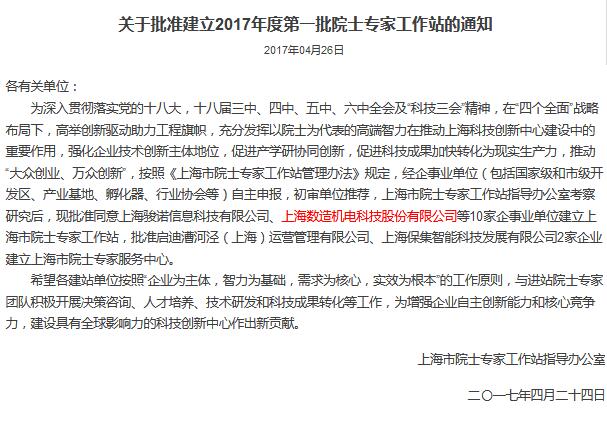 數(shù)造科技獲批建立滬上首家“院士專(zhuān)家工作站”